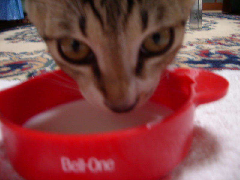 おびき出された猫、恨みがましい顔でミルクを飲みます。